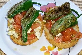 Ingredientes:4 molletes16 pimientos del padrón o celtas4 tomates4 dientes de ajo3 cucharaditas de orégano seco1 queso afuega´l pitu70 gr de aceitunas verdes o negrassalpimienta negraaceite de oliva
