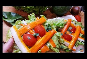 3.-Ponemos las hojas de la lechuga sobre cada rebanada de pan, las rellenamos con el aguacate. Cortamos los palitos de surimi en tiras y decoramos las tostadas con ellas. Lavamos los tomates, los secamos con papel de cocina, los cortamos por la mitad y los colamos sobre las tostadas. Le añadimos el orégano fresco, rociamos con un poco de aceite y salpimentamos la tostada.Servimos en seguida.
