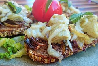5. Tostamos las rebanadas de pan y las cubrimos con las tiras de cebolla. Encima colocamos las alcachofas y espolvoreamos por encima con Mozzarisella rallada u otro queso vegano. Precalentamos el horno y horneamos las tostadas 5 minutos hasta que se derrita el queso.