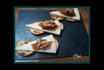 -Colocamos las tostadas de dos en dos-Ponemos encima una cuña de queso-Colocamos encima un poco de membrillo y media nuez