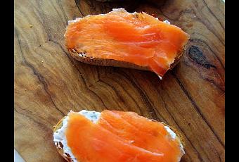 5ºCortamos las lonchas de salmón en tiras y las ponemos en las rebanadas con queso.