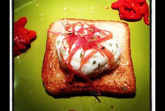 Una vez hechas y trascurridos los 4 minutos de hervor de los huevos, posamos el huevo, ya retirado de su bolsa, en la tostada, añadimos un poco de pimiento o jamoncito y listo para comer.