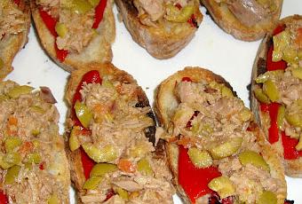 - Escurrir el aceite de la lata de atún y mezclarlo con la cebolla y el tomate. Añadir las aceitunas troceadas y mezclar con un chorrito de vinagre, aceite y el puntito que le queramos dar de sal.