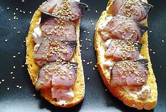 Colocamos cuatro lonchas de bonito por encima de cada rebanada de pan, aliñamos con aceite y espolvoreamos con el sésamo.