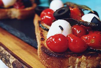 Para montar la tosta, en la base cubrimos con los calabacines a la plancha, después repartimos los cherrys confitados, ponemos unas bolas de mozzarela, unas aceitunas y un par de hojas crujitens, rociamos con aceite de oliva y listo.