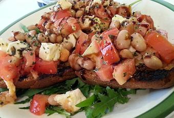 Es una tosta/ensalada, se puede compartir o incluso, comer o cenar. Delicada, sabrosa, nutritiva. Rápida de hacer (a parte las alubias) e ideal tanto en verano que en períodos más fríos.