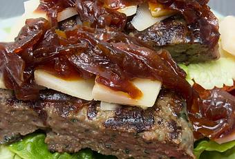 Ingredientes:Pan de barra pequeño de queso (o el que prefieras)1 filete de hamburguesa de queso y espinacaslechuga vive la frutaqueso grana padanocebolla caramelizada paladar selecto