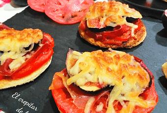 TOSTAS DE JAMÓN, TOMATE Y BREVAS GRATINADAS CON MOZZARELLA