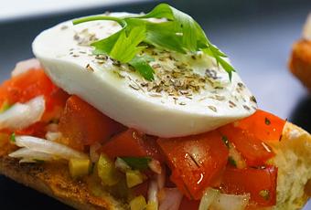 En primer lugar corte los tomates por la mitad y sáqueles las pepitas. A continuación pique los tomates, la cebolla y las aceitunas en trocitos muy pequeños y échelos todos en un bol. Reserve unas cuantas hojas de perejil y con el resto comprímalo en una pequeña bola y píquelo muy bien. Eche el perejil también en el bol junto con un chorro de aceite de oliva, salpimiente y con ayuda de una cuchara mezcle bien todos los ingredientes. A continuación corte el pan en pequeñas rebanadas y tuéstelas hasta que estén crujientes. Unte las rebanadas de pan con mantequilla o margarina y écheles por encima una capa del picadillo que hemos preparado anteriormente. Corte la mozzarella en medallones y coloque un medallón de mozzarella encima de cada rebanada de pan. Para terminar espolvoree con orégano cada medallón de mozzarella y coloque una hojita de perejil encima de cada uno. Sirva el aperitivo en la mesa.