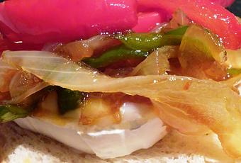 Corta el pan en rebanadas, calienta en el tostador . Coloca encima del pan una rueda de queso de cabra y encima los pimientos caramelizados a temperatura ambiente o templados.
