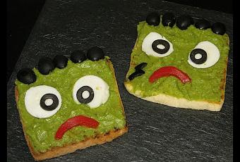 Cogemos nuestro pan de sándwich y tostamos, le untamos una generosa capa de guacamole por encima, puede ser comprado o podéis encontrar la receta en mi blog. Luego le hacemos los ojos con el huevo duro y una rodaja de aceituna negra.