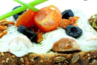 Ingredientes Tostas Originales (para dos tostas) 2 rebanadas gruesas de pan de cereales 4 salchichas frankfurt (grandes) 4 lonchas de queso gouda 1/4 de pimiento rojo Pan rallado Aceitunas negras 2 tomates cherry Mostaza L'Ancienne Sal Aceite de Oliva