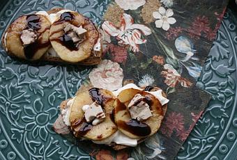 - Monta la tostada de la siguiente forma:queso de untar y rodajas de manzana.En el hueco central de la rodaja de manzana pon un trozo de micuit y deja que se ablande con el calor.