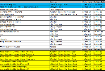 Luego esta que se venden bases de caballería monstruosa para WFB.En packs de 3 por 4,95$(Unos 3,75 euros al cambio).Eso esta bien,pero no recuerdo ahora que figuras que antes no tenían ese tipo de base la llevan actualmente.Luego,que todos los lanzamientos se centran entre hoy día 23 y el día 2 de Marzo,saliendo solo una cosa a mediados de mes,la caja de batallón de Demonios.
