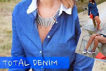Buenos días por la mañana! Lunes, 1 de septiembre; vaya trauma para los que volvéis al trabajo, siendo positivos, como yo llevo todo el verano trabajando, eso no me pasa; puede que incluso sea al revés, me traumatiza pensar que se me acaba el contrato: SEÑORAS Y SEÑORES, no penséis que estoy loca, me gusta mi trabajo y no quiero dejar de ejercer, pero tampoco voy a negar que si puedo me iré de vacaciones a la mínima que pueda. Bueno, dramas personales a parte, hoy os dejo con una adaptación veraniega de una de las tendencias para este otoño/invierno que es el TOTAL DENIM. Tanto en los mismos tonos, como mezclando tonos diferentes (lo cual lo facilíta ya que esto de los tonos del denim es un empezar y no acabar)Con detalles en naranja que no dejan que sea demasiado triste, este es el resultado. ¿Qué os parece?