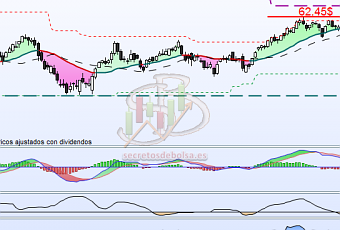 De todas formas, para los que estáis dentro del valor de momento mantener porque se trata de un valor alcista y fuerte, y mientras no se aprecie un síntoma de debilidad en él debéis permanecer en él. Hay que tener en cuenta que tiene una resistencia en 67,52$ muy próxima al nivel de precios donde se encuentra y que se trata de una cotización que no se alcanza desde principios del 2010 por lo que está bastante consolidada. A partir de ahí, si consigue superar ese obstáculo tiene un gran potencial de subida hasta los máximos históricos. Pero seguimos sin poder montarnos en el tren por tener el sector débil.