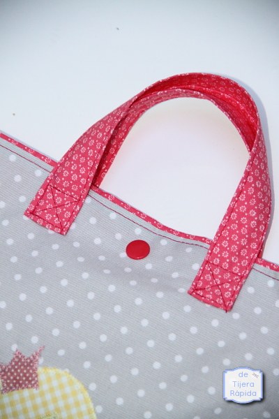 Unas asas adecuadas al tamaño de la futura propietaria. Todo el interior del tote bag va forrado con la tela fucsia, si queréis saber como hacer un bolso de este tipo, hace tiempo que publiqué un tutorial con todos los pasos.
