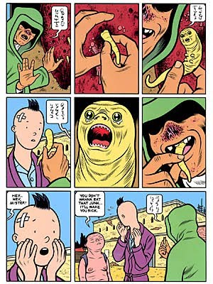 Tóxico, el nuevo trabajo del autor de Agujero Negro, es la primera entrega de una trilogía consistente en mezclar la juventud de Charles Burns, el mundo pesadillesco de William S. Burroughs y las ilustraciones de Tintín. Con un color impresionante y mucha simbología, os aconsejo seguir esas huellas de las viñetas en el estupendo reportaje que Iván Aliaga preparó para este especial de El Mundo