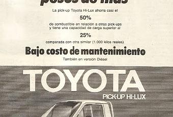 La vieja publicidad nos trae la imagen de una camioneta Toyota Hi-Lux, la primera que conocimos en Argentina. Tal vez una camioneta bisagra dentro el mercado interno. La acompañaron otras marcas niponas y fue todo un descubrimiento en materia de utilitarios.