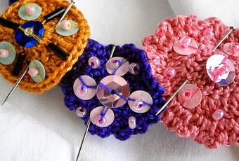 Lentejuelas, bolitas y canutillos de cristal cosidas sobre rosetas de colores.