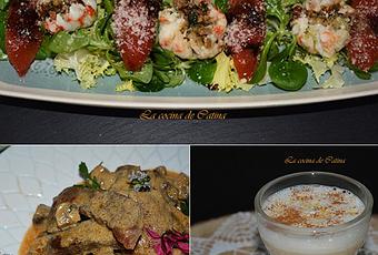 Este menú esta compuesto de tres platos a cada cual mas rico y reúne el saber de la cocina de siempre con la cocina de vanguardia que tan de moda se ha impuesto.Como entrante tenemos una Ensalada templada de langostinos rellenos (del Chef Luis F. Puga, que regenta el Gastrobar La Fábrica), deliciosa