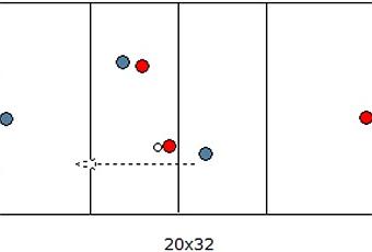 Descripción: 2×2 con dos porteros en un campo de20x32m. Dividido en 4 zonas de 8 metros cada una. En ataque, ambos equipos intentarán, tanto en el juego de equipo como en el individual conseguir el mayor número de goles posibles.