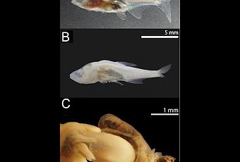 Figure 3. Digestive system of an Astyanax fry. A A live specimen photographed in the Pachón cave. Note the healthy-looking appearance of this juvenile, the two parts of the inflated swim bladder, the almost completely degenerated eye, and the digestive system filled with food. Scale bar as in B. B Body, with the digestive system exposed C Stomach and intestine. Notice that the food content can be seen through the translucent walls. All fish studied were well fed and their guts were full of food.Este trabajo aporta un estudio de la alimentación de los juveniles y los adultos de esta especie de peces de cuevas de México. Un fantástico trabajo que podéis ver y descargar íntegro en la página web de la revista, en el siguiente enlace: