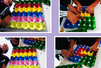 Los estudiantes del cuarto año de básica, realizaron un trabajo de Collage en las cubetas de cartón de huevo, pegaron sobre ellas, elementos pequeños como: ligas, pepitas de colores, tenedores de plástico pequeños y hojas secas.Utilizaron silicona líquida y con la pistola.
