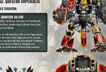 Ayer se me paso un nuevo adelanto de las reglas del Codex Imperial Knights que se pone en pre-pedidos hoy, pero gracias a la gente de BoLS lo visto. Son las tradiciones de dos Casas mas, Mortan, que es una Casa de Caballeros y Krast, que es una Casa aliada del Mechanicum.Games Workshop no lo puso en Warhammer Community, sino en su pagina oficial de Facebook. Las dos Tradiciones mostradas están orientadas al combate Cuerpo a a Cuerpo. Los Krast son verdaderas maquinas de matar (Y no es una metáfora!) unidades Titánicas enemigas, mientras que los Mortan no tienen esa afinidad para cazar Titanes enemigos, pero siguen siendo unos combatientes tan letales como los Knights de la Casa Krast.