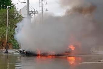 De acuerdo con información preliminar, el tráiler habría perdido el control debido al gran encharcamiento que se encuentra en la vialidad, por lo que terminó chocando contra una contención y el motor comenzó a prender fuego.
