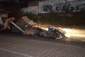 El tracto camión que arrastraba una caja con carga, chocó contra el puente de Soledad, quedándose sin el techo y tirando parte de la carga consistente en láminas de cartón. El conductor abandonó la caja de la unidad.