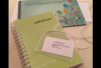 Antes de entrar tendréis que recoger una identificación para que la llevéis colgada y así es más fácil conocer los nombres de las demás Au Pairs. El training se realiza en la sala que está al lado del desayuno. Allí habrán muchas mesas redondas con un libro verde que se compone de dos parte: "Training Guide" y "Daily Guide", bolígrafos y papel para notas. Una de las primeras cosas que intentaréis hacer será entrar en Internet con vuestro móvil y ¡Ups! resulta que por razones obvias no os darán la contraseña de Internet de esta sala hasta el último día.