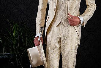 Modelo 1879 Ottavio Nuccio GalaTraje de época modelo redingote brocado dorado con pedrería cristal dorada.Completa el conjunto con chaleco de época a juego brocado dorado con bordado oro y foulard de raso marfil con pañuelo de bolsillo a juego.