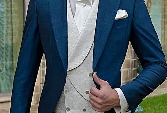 Traje de novio Chaqué azul royal en lana mohair alpaca. Modelo solapas de pico con 1 botón y una abertura. Tejido azul royal mixto lana mohair alpaca. Chaqué 2393 Colección Gentleman Ottavio Nuccio Gala.Coordinado con chaleco cruzado tejido "Jacquard" con 6 botones madre perla.http://www.comercialmoyano.com