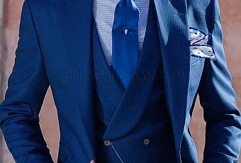 Traje italiano a medida azul royal con solapa de pico y un botón madre perla en tejido mixto lana Pata de Gallo. Traje de novio 2185 Colección Fashion Color Ottavio Nuccio Gala.
