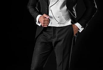 Modelo 1860 Ottavio Nuccio GalaTraje italiano semilevita negro con solapa pico, vivos de raso y un botón fantasía en tejido mixto lana. Coordinado con chaleco cruzado blanco en piqué de algodón con solapa y 6 botones madre perla, corbatón fucsia con lunares blancos en jacquard de pura seda y pañuelo en pura seda blanco con diseño paisley y ribetes color fucsia.Coordina tu traje con los siguientes accesorios: