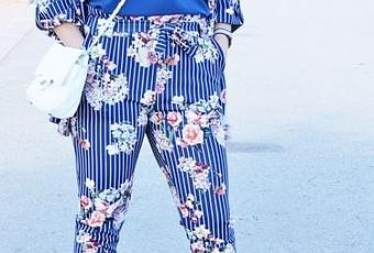 En esta ocasión os muestro un traje de dos piezas compuesto por pantalón fruncido con lazada y por una chaqueta de tres cuartos de manga (se convierte en manga entera). Es un traje azul marino con un estampado muy original, pues a la vez lleva finas rayas diplomáticas y flores estampadas.