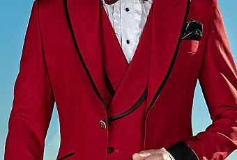 Traje italiano a medida rojo solapa moda a pico y perfil en contraste negro con 1 botón, coordinado con chaleco a juego. Modelo 2517 Fashion Color Ottavio Nuccio Gala.