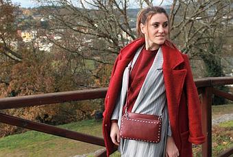 Por encima abrigo de borreguillo también en color burdeos, super amoroso, cual oso de peluche, sneakers en blanco y gris y bolso bandolera también en burdeos.