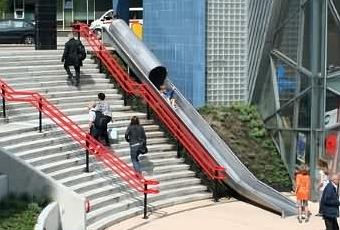 Una de las mejores maneras de fomentar el buen comportamiento es hacer que sea divertido, y esta estación recién renovada en Utrecht es un gran ejemplo. Ha sido nombrado como el Transfer Accelerator, ofrece a los viajeros una nueva forma de bajar por la escalera a la entrada de la estación de Overvecht. No sólo de manera más atractiva, también es un poco más rápido. Diseñado por HIK Ontwerpers como parte del proyecto de remodelación de la estación, es sólo una de las muchas adiciones para mejorar la usabilidad, la sostenibilidad y la seguridad de la nueva estación.