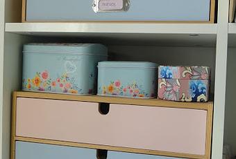 Para estas cajoneras de Ikea hay mil ideas por internet, aunque yo simplemente he aplicado un par de capitas de diferentes colores en los frontales de los cajones y pegado unas mariposas.
