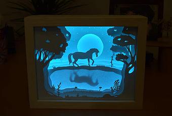 Con un poco de imaginacion y pulso para dibujar, tendrás la caja 3D que quieras, ella dibujó un caballo caminando entre arboles y una luna de fondo que hacen una imagen espectacular, tu también podrías tener la tuya y dibujar lo que quieras.