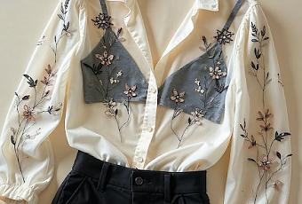 - Una blusa de tul negra con detalles bordados, combinada con un pantalón de corte recto en tonos neutros.