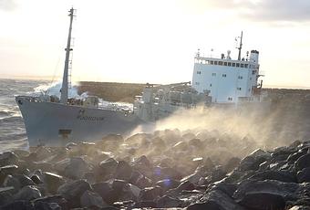 Un navío de transporte de cemento encalló en un rompeolas en la costa oeste de Islandia durante el fin de semana.