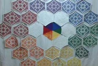 ¡Ya estaban todos los bloques! Aquí llego otra crisis: " no me gustaba la composición". El montaje de este trabajo me quito algunas horas de sueño. Tenia la impresión de tener una losa en la cabeza.... ¡Las piezas blancas! ¡Otra vez las piezas blancas! Tan bonitas, y cuando las colocaba en la sabana de diseño no se veía el trabajo, solo una masa blanca....¿Cómo integrarlas? Hasta que alguien me dijo: ¡Píntalas!¡Si claro! ¡qué fácil! ¿Y si me las cargo?.... Otro alguien dijo: "Los bloques son preciosos", "Ese diseño no dice nada" ¡Dales un sentido!¡Si claro! ¡qué fácil! ¿Qué hago? ¡UN VORTICE! Lo tenía que intentar, empecé dándole color a mi bloque blanco, si lo estropeaba siempre podría hacer otro: