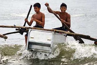 Por lo general un pescador captura un pez y lo pone en la nevera. En una aldea filipina destrozada por el tifón los pescadores se suben en la nevera y luego van a pescar.