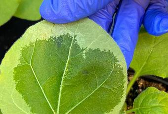 Hoja de Nicotiana benthamiana recién infectada.