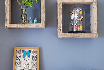 Un marco, un cajón o una caja desfondada (como ha sido nuestro caso)..., pueden transformarse, en un momento, en ligeras estanterías que cambien por completo el aspecto de una pared. ¿No os parece una propuesta decorativa sencilla y encantadora?