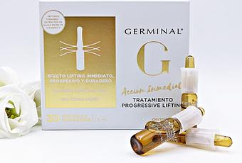 El Tratamiento Progressive Lifting de Germinal, basándose en la formula original de las ampollas flash y de una combinación de péptidos, crea un nuevo producto antiedad de acción progresiva, con resultados visibles en 15 minutos y una firmeza de la piel efectiva en tan solo 28 días, disminuyendo arrugas y líneas de expresión con su uso diario.