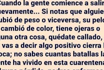 La cuarentena ha tenido un alto impacto para todos nosotros, para nadie ha sido sido fácil lidiar con las precauciones que se han implantado para contener un rápido numero de contagios y mucho menos con las políticas absurdas de muchos gobiernos que han quebrado y dejado sin trabajo a miles, sin hablar de como algunas autoridades abusan de decretos presidenciales o municipales para ultrajar los derechos de las personas.Sin duda todos nos hemos visto muy perjudicados por la cuarentena, todos estamos cargando un cruz que de una u otra forma así para los demás no parezca esta es bastante pesada, es poco lo bueno que podamos mencionar que nos haya ocurrido en este 2020, ojala es que de tantas dificultades que estamos afrontando seamos mejores seres humanos.Los tiempos difíciles crean personas fuertes, ojala esto pase con lo que estamos viviendo en estos momentos, pero lamentablemente los seres humanos somos una porquería y lo mas probable es que muchos no aprendan nada de esta experiencia, muchos seguirán de seguro siendo unos hipócritas, unos arribistas, unos aprovechados de las necesidades de otras personas, unos corruptos que no tengan empatia alguna.Si usted tiene algo de las cualidades anteriormente mencionadas trate de ser mejor persona, no tanto por los demás pues ellos se adaptaran a vivir con personas asquerosas como usted, hágalo por usted mismo, para que tenga una consciencia tranquila, para que su corazón encuentre paz y satisfacción, para que conozca lo grato que es ser útil a esta sociedad en vez de ser una carga a la misma.Ojala todos seamos mas conscientes después de esta experiencia, todos evitemos criticar o abusar a los desafortunados, porque de no ser así de seguro la próxima crisis nos dará mas duro.